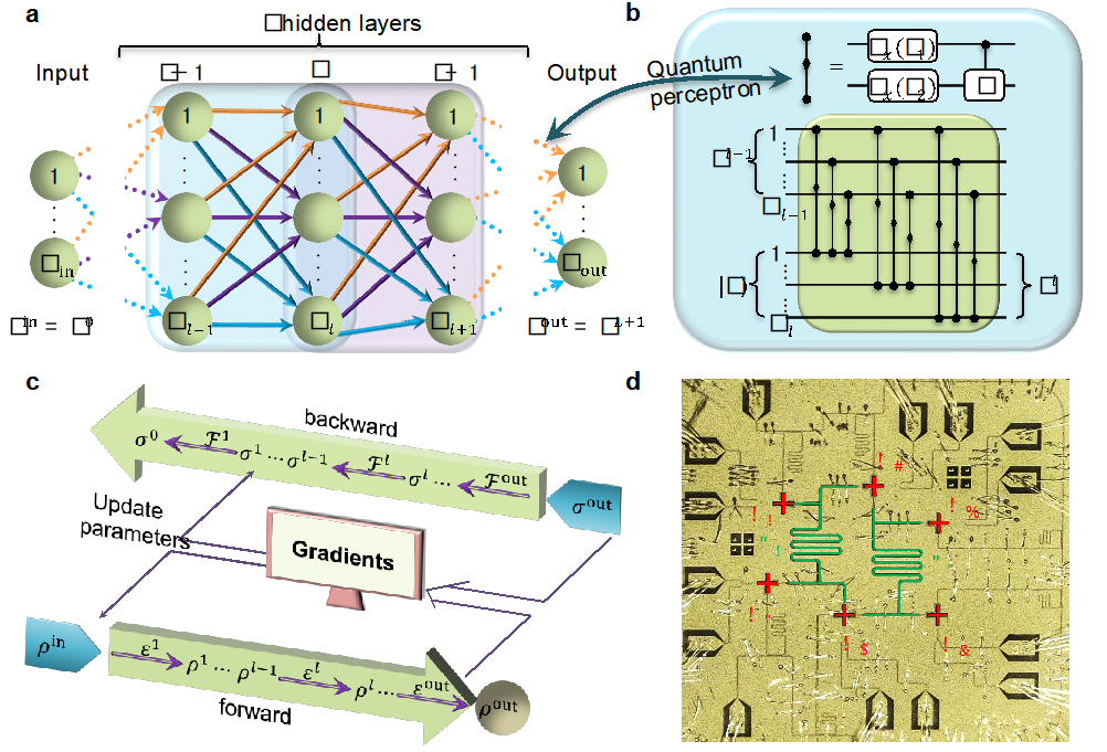 Recently, Luyan Sun’s research group and Dong-Ling Deng’s research group have designed a quantum BP algorithm for DQNNs with the layer-by-layer structure, and demonstrated the trainability and generalization capacities of DQNNs on a superconducting processor. In the framework, qubits are arranged into multiple layers, and the quantum perceptron is defined as a parameterized quantum circuit applied to the corresponding qubit pair at adjacent layers. A sequential combination of the quantum perceptrons constitutes the layerwise operation between adjacent layers. In the forward process, the quantum information is mapped layerwise from the input layer to the output layer. In the backward process, the quantum information is mapped layerwise from the output layer to the input layer. When evaluating the gradients with respect to all parameters at adjacent two layers, one needs to separately run the DQNN in the forward and backward way, and extract the local information from these two layers, rather than the full DQNN.