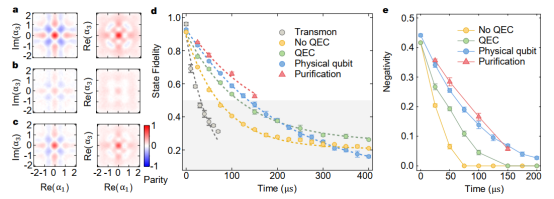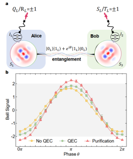 Specifically, the research team achieved binomial encoding of logical qubits in two spatially separated bosonic modes, establishing entanglement between the two logical qubits (Fig.1). Different form the entanglement between physical qubits, the entanglement between logical qubits exhibits stronger robustness to local noise, and it can be restored by local quantum error correction operations rather than dissipating directly into the environment. The research team protected entangled logical qubits through repetitive quantum error correction, resulting in a 45% improvement in the coherence time of the entangled logical qubits compared with their unprotected counterparts (Fig.2). Moreover, the research team demonstrated, for the first time, that entangled logical qubits can violate Bell inequalities through error detection and purification (Fig.3).
