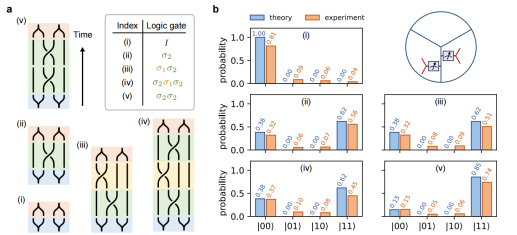 After the preparation of the ground state, the topological entanglement entropy is measured, which agrees well with theoretical predictions. In particular, two pairs of Fibonacci anyons are generated through string operator manipulations on the prepared ground state and their braiding operations are demonstrated (Figure 3). A variety of different braiding sequences are designed in this experiment to test the characteristics of Fibonacci anyons (see Figure 3a), including: (i) Annihilation of Fibonacci anyons; (ii) Braiding changes the fusion results; (iii) and (iv) Verifying the Yang-Baxter equation with the same fusion results of two different braiding sequences; (v) Measurement of the quantum dimension of Fibonacci anyons. The experimental results were in excellent agreement with theoretical predictions (see Figure 3b). The quantum dimension of the Fibonacci anyon calculated from the experimental results of the braiding sequence (v) is 1.598, very close to the theoretical prediction of the golden ratio 1.618.