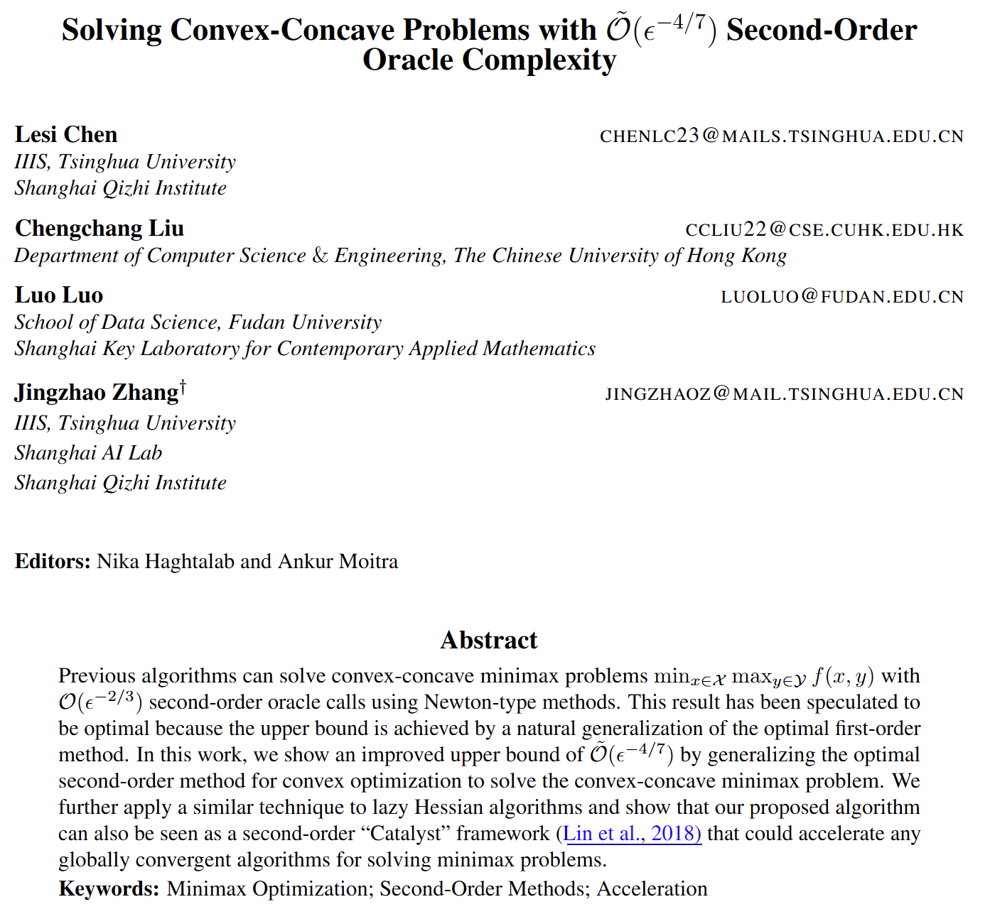 Ph.D. student Lesi Chen and Assistant Professor Jingzhao Zhang from Tsinghua University's Institute for Interdisciplinary Information Sciences have received the Best Student Paper Award at the 2025 Conference on Learning Theory (COLT), a top-tier venue in theoretical machine learning. Their winning work is titled "Solving Convex-Concave Problems with O( ε^-4/7) Second-Order Oracle Complexity".
