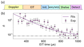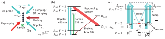 在本工作中,研究人员演示了用137Ba+ 离子(I=3/2)进行EIT冷却。研究人员修改了用于量子比特状态初始化的激光设置,以在开放系统中执行EIT冷却。尽管在EIT冷却过程中S态所有zeeman能级都涉及到动力学,但EIT泵浦光束同时作为再泵浦光束,将所有态保持在冷却子空间中。研究人员在实验上将单个137Ba+离子的两种径向模式声子分别冷却到0.08和0.15。通过使用相同的激光参数,研究人员进一步将五个离子链的所有径向模式冷却到接近基态。
