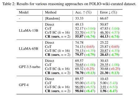 研究团队选择在FOLIO wiki和AutoTNLI、24点游戏、MATH数据集上对“累积推理”框架进行检验。结果表明,在FOLIO wiki和AutoTNLI数据集上“累积推理”框架始终优于现有方法,显示出高达9.3% 的提升。特别是在校对后的FOLIO wiki curated数据集上,CR达到了98.04% 的准确率。在围绕24点游戏的实验中,CR达到了98% 的准确率。值得注意的是,与先前的最先进的方法ToT相比,这一数字有着高达24%的显著提升。MATH数据集的实验结果表明,CR算法在两种不同的实验设定下,均达到了超出当前已有算法的正确率。其中CR总体正确率可达58%,并在Level 5的难题中实现了42%的相对准确率提升,建立了GPT-4模型下的新SOTA。