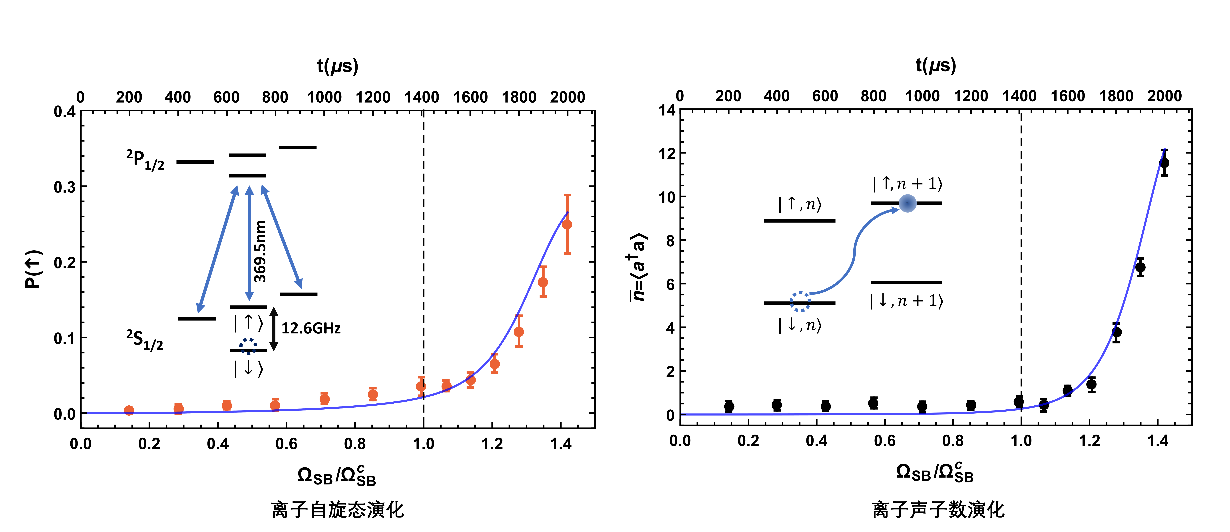 量子相变一般需要多体系统在热力学极限下才能发生,而单离子量子拉比模型可以展示一种新的量子相变,其热力学极限不在依赖于无穷多的离子,而是通过某些系统参数的比例趋于无穷来实现。这种新的量子相变近年来在理论上引起广泛关注,但实验上尚未观测到,因为其需要调控量子系统到极端的参数空间。段路明研究组发展了离子的量子调控方法,利用绝热演化和高纯度的态制备,将量子拉比模型推到极端的参数空间,在此基础上观测了两个序参量的变化,包括离子自旋态和描述离子运动的声子数,通过观测序参量的演化,成功获得了该模型存在量子相变的证据。该实验发展的量子调控方法在离子量子计算与模拟中也有重要应用。