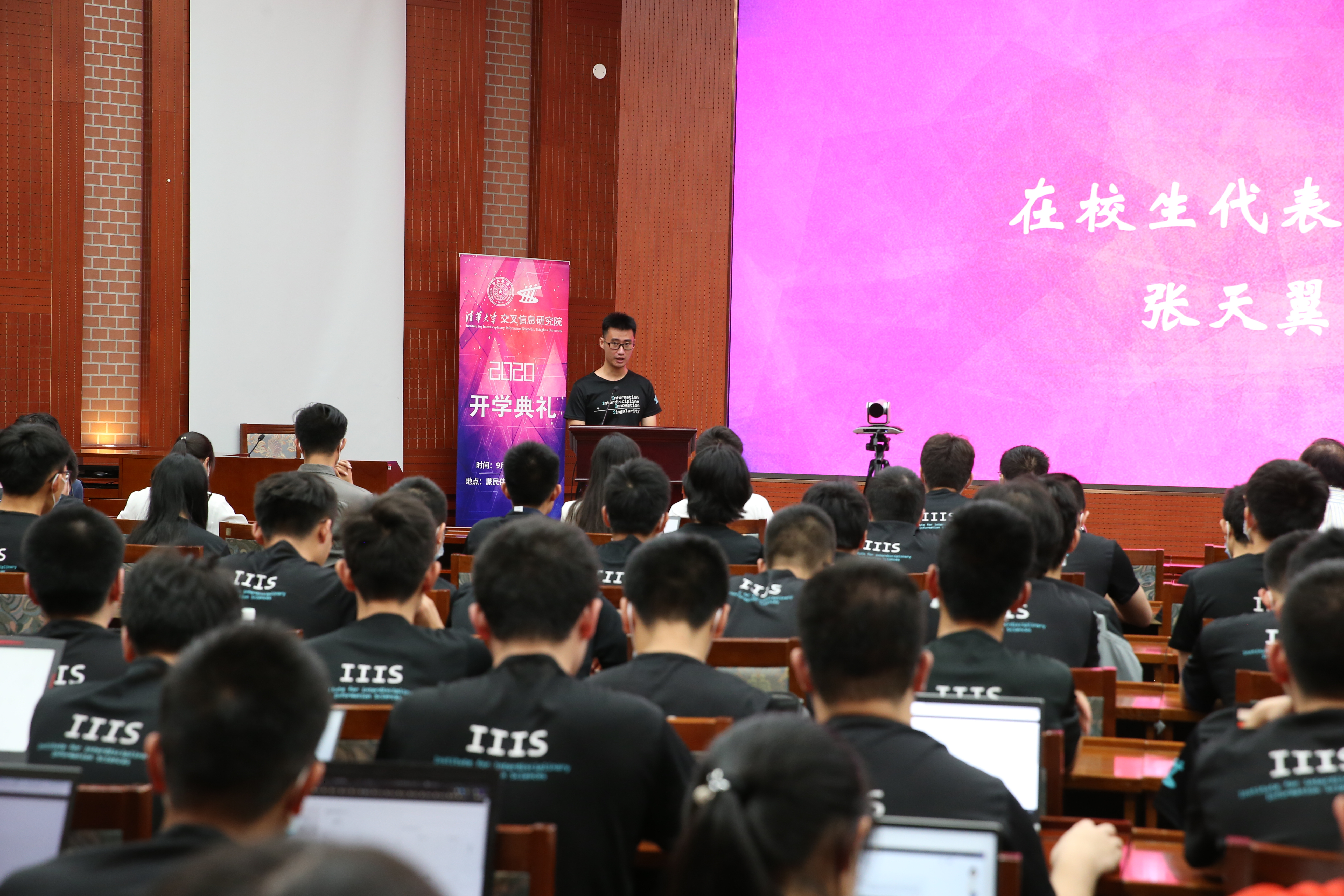 2016级博士生张天翼代表在校生发言。他援引杨斌教授的报告内容,分享在百年未有之大变局的宏观背景下,清华在人才培养中的两个重大理念:多样发展与通识树人。张天翼与学弟学妹共勉,既要优势互补、相互提携,也要在面对未知的挑战时能够灵活应对。