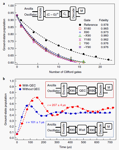 孙麓岩研究组在实验中利用一个辅助超导量子比特与微波光场耦合,实现了基于微波光子数按二项式系数叠加的量子态的编码,通过量子反馈控制有效地对抗微波光子损耗。在实验中,该研究组发展了基于可编程逻辑门阵列的快速、实时量子反馈技术,同时利用接近量子极限的微波放大器实现了量子比特快速、高保真度读取。基于这两项技术,他们实现了对逻辑量子比特的连续量子纠错,将相干时间延长为没有量子纠错时的2.8倍;同时,实现了对单个逻辑比特高保真度通用量子门操作,平均门操作保真度为97.0%;此外,还首次实现了在量子纠错保护下的逻辑比特上的量子操作,演示了Ramsey干涉实验,将其相干时间提高了2倍。