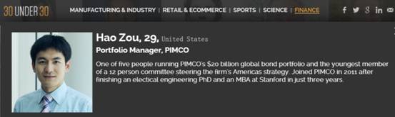 录取的首批学生之一,29岁时即已担任美国太平洋投资管理公司(PIMCO)史上最年轻的基金经理。在加入PIMCO之前,他作为斯坦福历史上最年轻的代表,多次参加美国和国际通信协议制定与谈判工作,是世界通信领域的领先学术机构马可尼协会40年历史上被选举出的最年轻的董事会成员,并在2014年底被选为协会历史上最年轻的秘书长。2016年初,有着过硬的互联网技术以及丰富的金融管理经验的邹昊从太平洋投资管理公司辞职,致力于在华尔街、硅谷创办一个全球领先的金融投资管理和金融科技公司。
