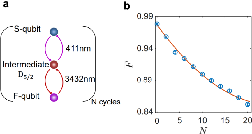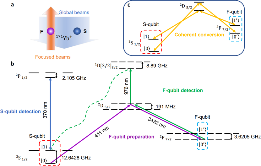 Trapped ions constitute one of the most promising systems for implementing quantum computing and networking. For large-scale ion-trap-based quantum computers and networks, it is critical to have two types of qubit: one for computation and storage, and another for auxiliary operations such as qubit detection, sympathetic cooling and entanglement generation through photon links. Previously, it was assumed that the dual-type ion qubits must be implemented in hybrid systems of two ion species. However, it is challenging to control the fraction and the positioning of each qubit type in many-ion crystals. The researchers resolve these challenges by implementing two coherently convertible qubit types using one ion species, and have demonstrated dynamic conversion between two types of qubit. This work is also introduced by Prof. Hempel from ETH in News & Views of Nature Physics, who regarded that “the addition of this method for coherent conversion to the quantum information toolbox marks a clear advance for the field”.