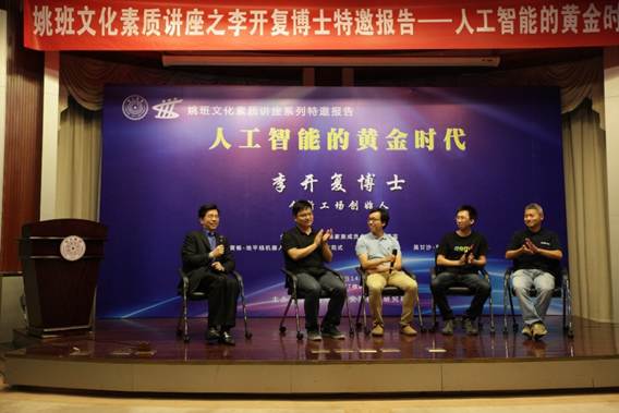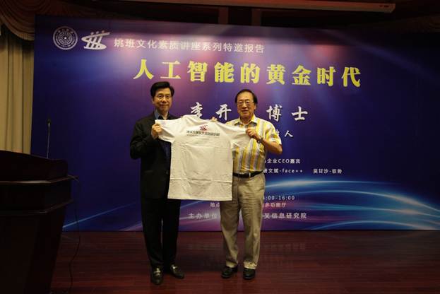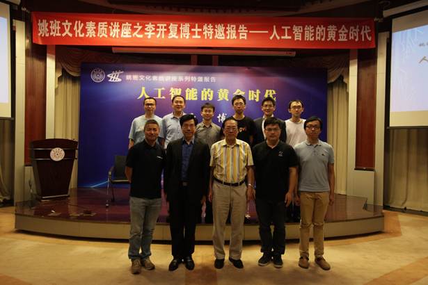 Dr. Kaifu Lee, founder of Innovation Works was invited to give a talk, entitled “The Golden age for Artificial Intelligence”, to Yao Class students on the afternoon of June 8, 2016, along with four CEOs (Chang Huang, Wenyuan Dai, Wenbin Tang and Gansha Wu) from the business. The event attracted a packed audience of nearly 200 people at Lecture Hall, FIT Building.