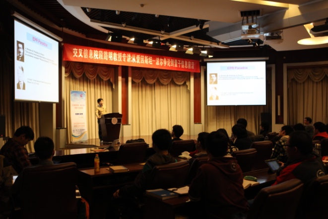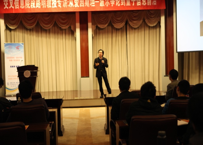 (By Shuai Sun) February 27, Prof. Luming Duan spoke on the topic “From Einstein-Bohr Debate to the Frontier of Quantum Information” in FIT Lecture Hall, attracting over 100 students from Tsinghua University, Peking University, Beihang University, Beijing Institute of Technology and so on.