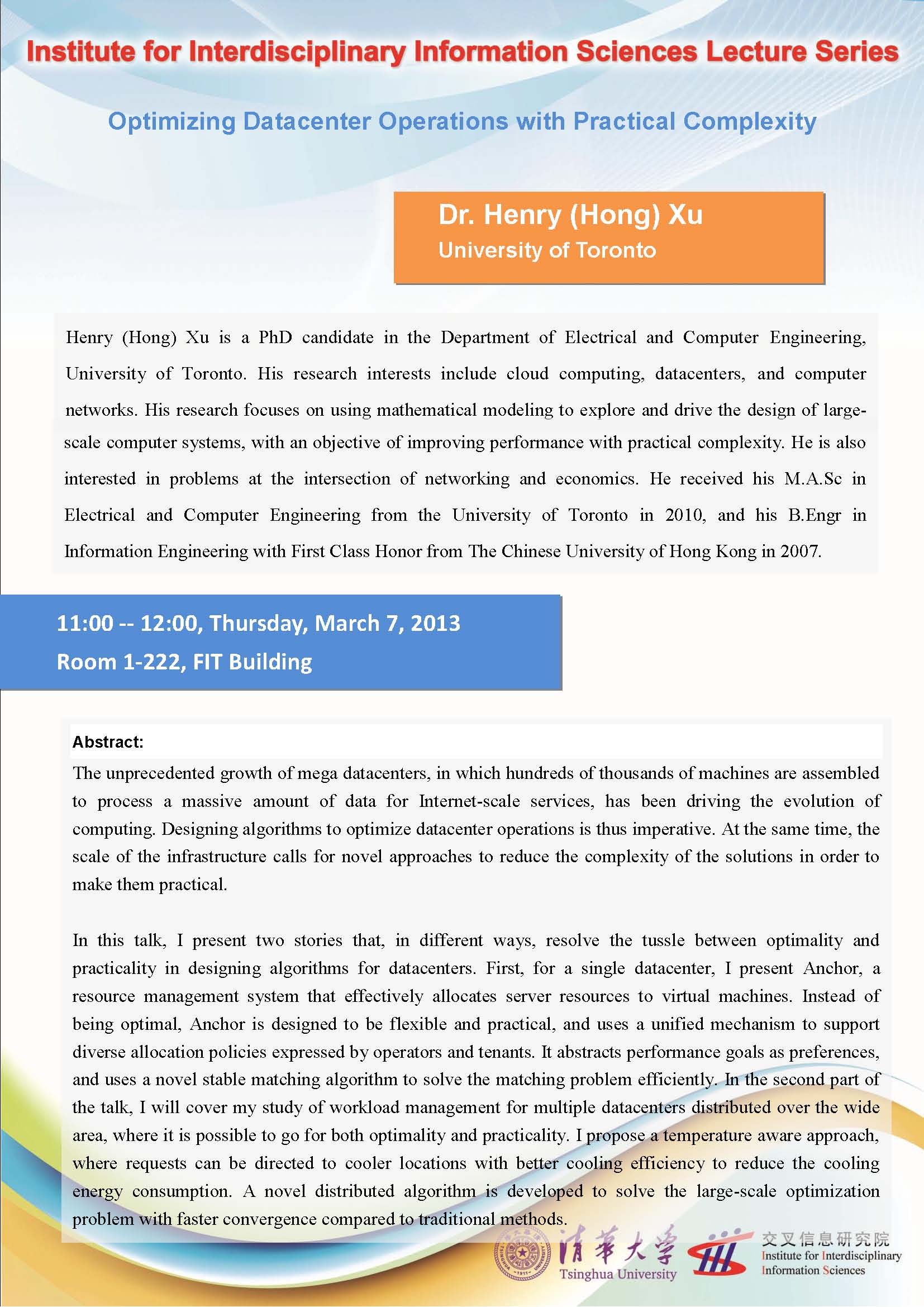 In this talk, I present two stories that, in different ways, resolve the tussle between optimality and practicality in designing algorithms for datacenters. First, for a single datacenter, I present Anchor, a resource management system that effectively allocates server resources to virtual machines. Instead of being optimal, Anchor is designed to be flexible and practical, and uses a unified mechanism to support diverse allocation policies expressed by operators and tenants. It abstracts performance goals as preferences, and uses a novel stable matching algorithm to solve the matching problem efficiently. In the second part of the talk, I will cover my study of workload management for multiple datacenters distributed over the wide area, where it is possible to go for both optimality and practicality. I propose a temperature aware approach, where requests can be directed to cooler locations with better cooling efficiency to reduce the cooling energy consumption. A novel distributed algorithm is developed to solve the large-scale optimization problem with faster convergence compared to traditional methods. Short Bio: