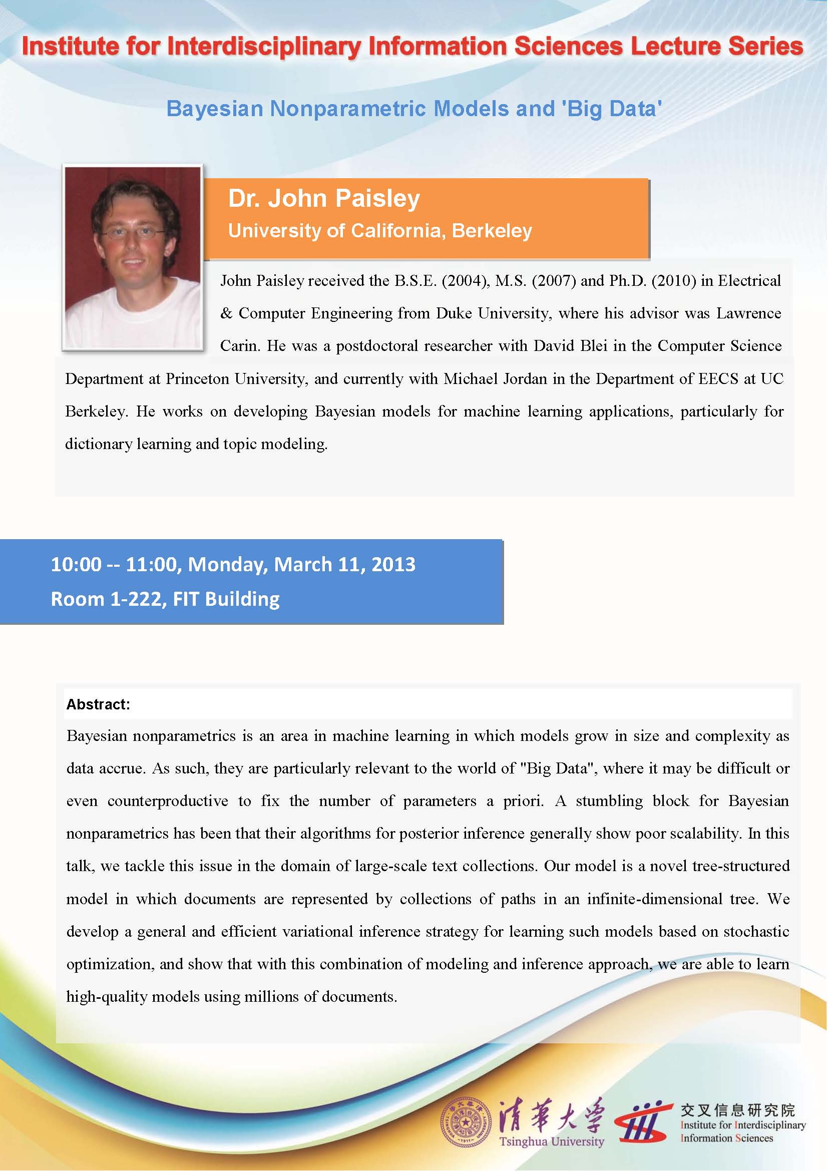 John Paisley received the B.S.E. (2004), M.S. (2007) and Ph.D. (2010) in Electrical & Computer Engineering from Duke University, where his advisor was Lawrence Carin. He was a postdoctoral researcher with David Blei in the Computer Science Department at Princeton University, and currently with Michael Jordan in the Department of EECS at UC Berkeley. He works on developing Bayesian models for machine learning applications, particularly for dictionary learning and topic modeling.