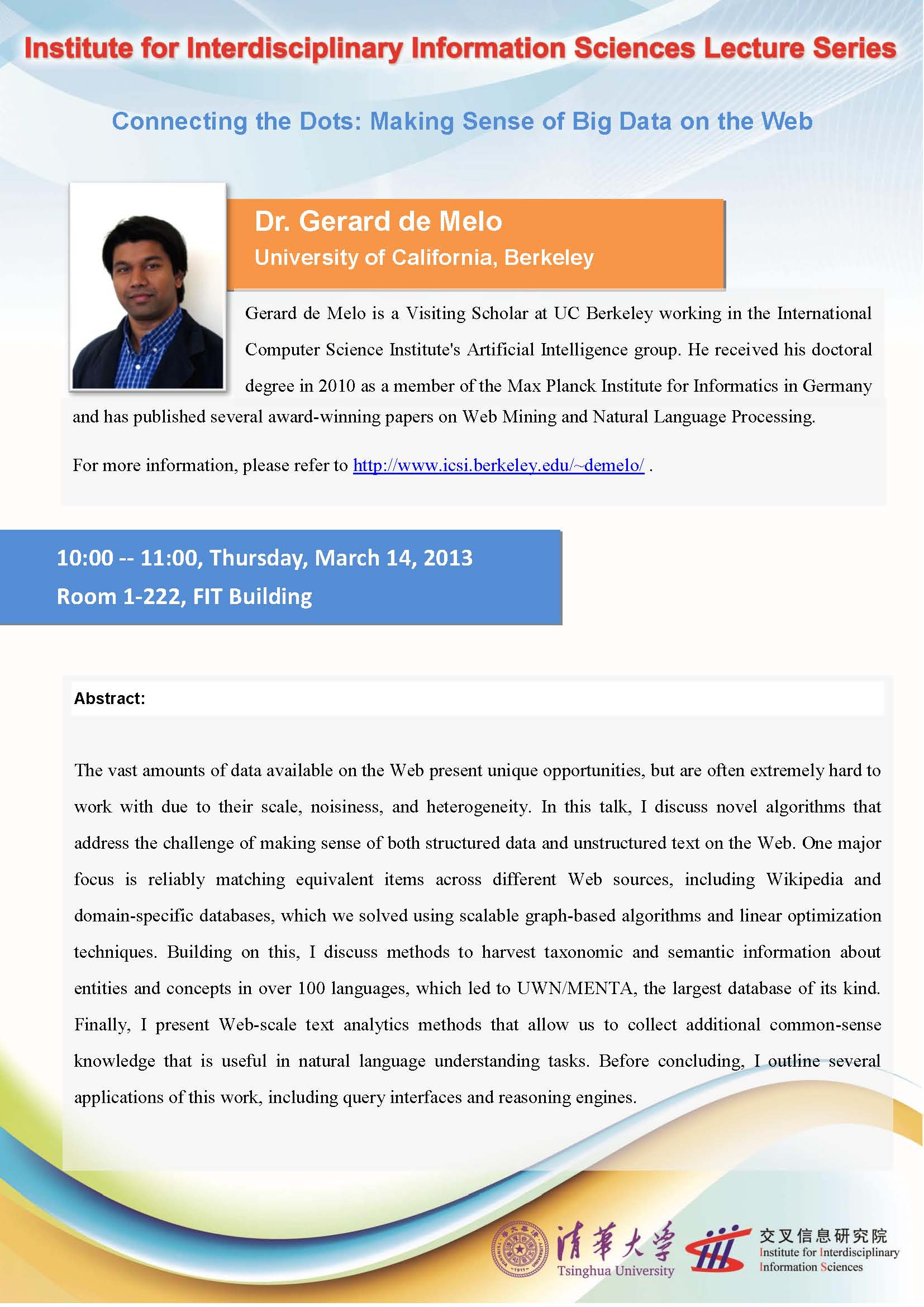 Gerard de Melo is a Visiting Scholar at UC Berkeley working in the International Computer Science Institute's Artificial Intelligence group. He received his doctoral degree in 2010 as a member of the Max Planck Institute for Informatics in Germany and has published several award-winning papers on Web Mining and Natural Language Processing.