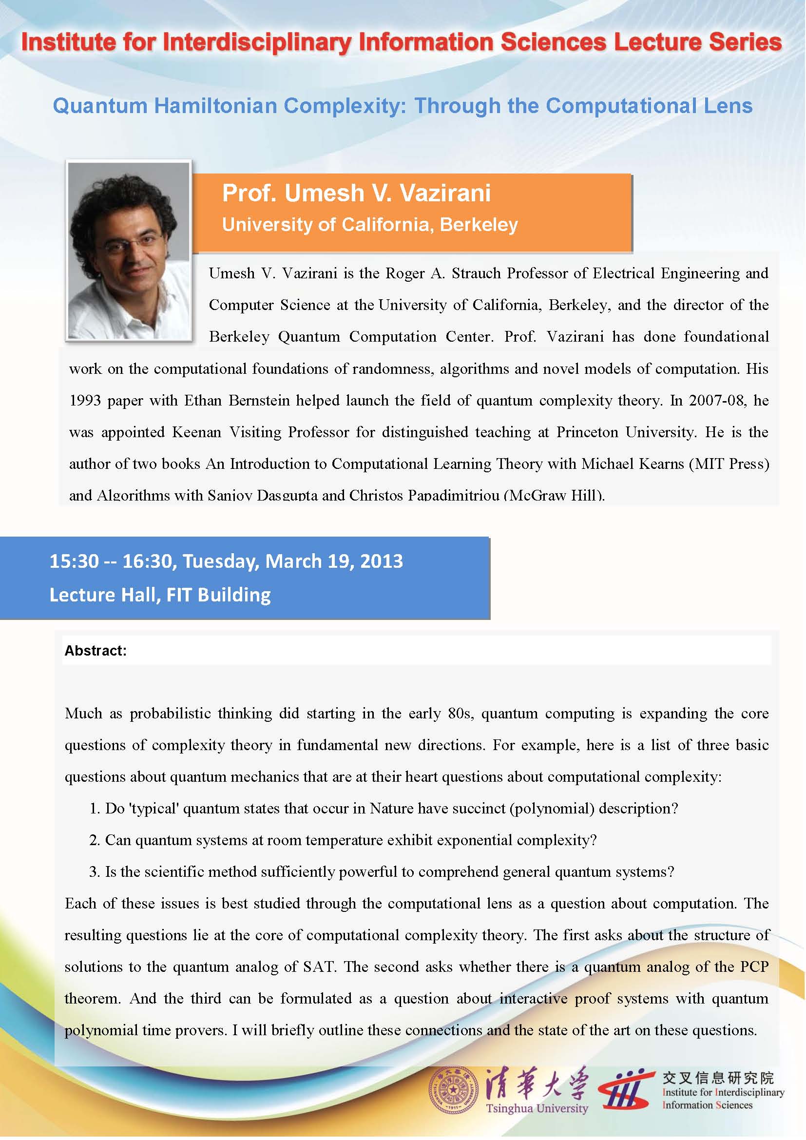 演讲人 <a href='//www.cs.berkeley.edu/~vazirani/' target='_blank'>Umesh V. Vazirani</a> University of California, Berkeley 时间 2013-03-19 15:30-2013-03-19 16:30