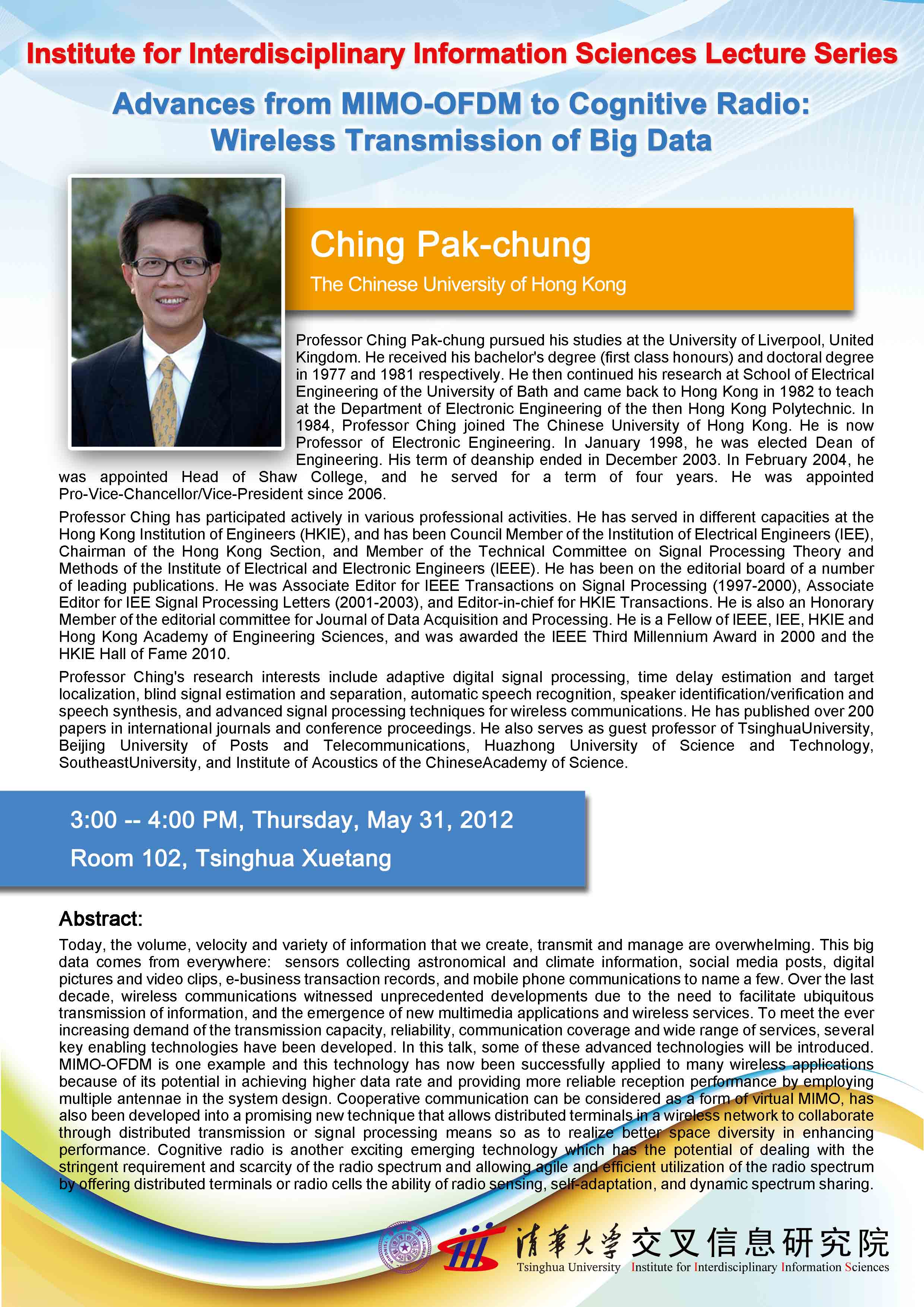演讲人 <a href='//www.ee.cuhk.edu.hk/~pcching/welcome.html' target='_blank'>Ching Pak-chung</a> CUHK 时间 2012-05-31 15:00-2012-05-31 16:00
