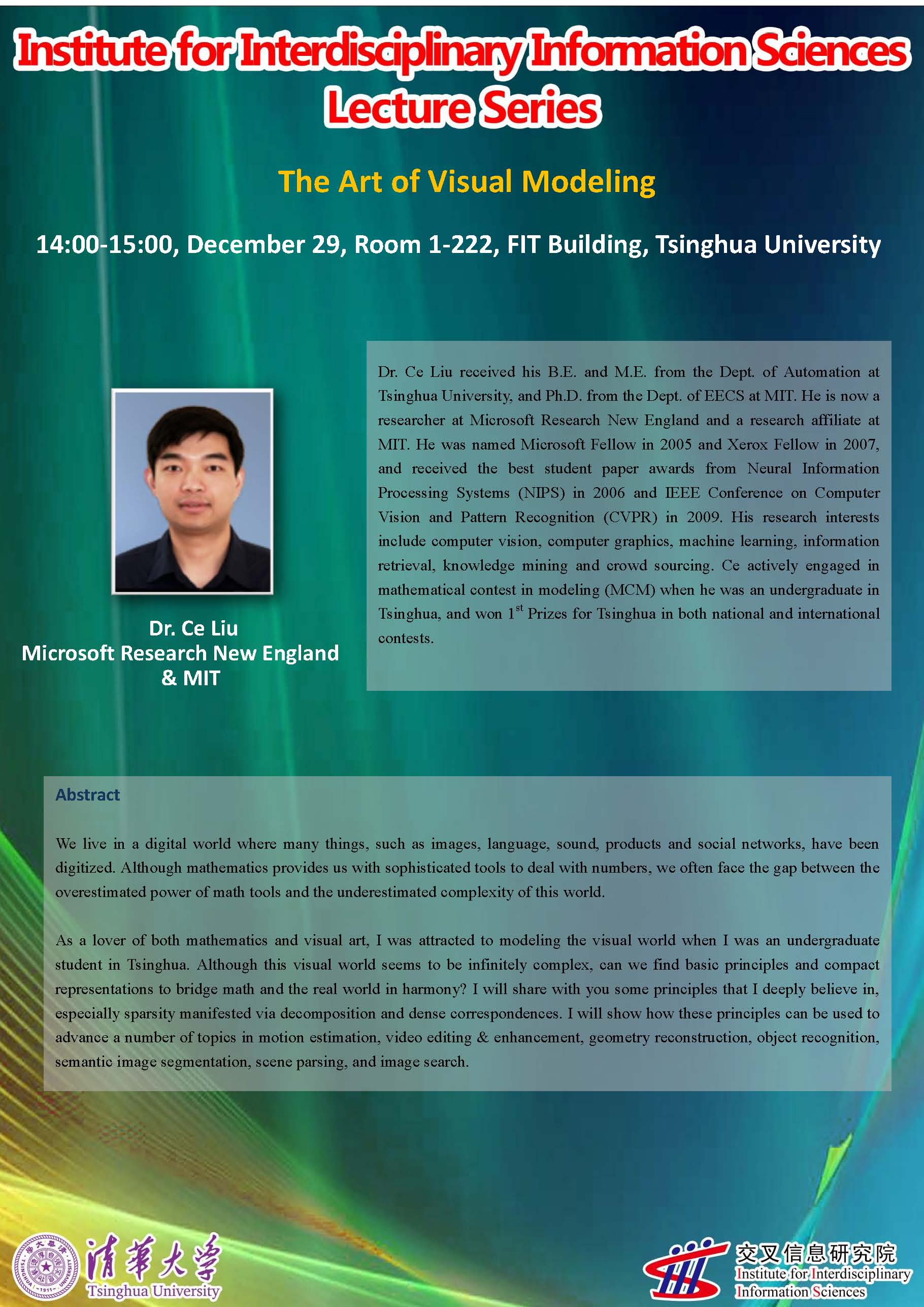 Dr. Ce Liu received his B.E. and M.E. from the Dept. of Automation at Tsinghua University, and Ph.D. from the Dept. of EECS at MIT. He is now a researcher at Microsoft Research New England and a research affiliate at MIT. He was named Microsoft Fellow in 2005 and Xerox Fellow in 2007, and received the best student paper awards from Neural Information Processing Systems (NIPS) in 2006 and IEEE Conference on Computer Vision and Pattern Recognition (CVPR) in 2009. His research interests include computer vision, computer graphics, machine learning, information retrieval, knowledge mining and crowd sourcing. Ce actively engaged in mathematical contest in modeling (MCM) when he was an undergraduate in Tsinghua, and won 1st Prizes for Tsinghua in both national and international contests.