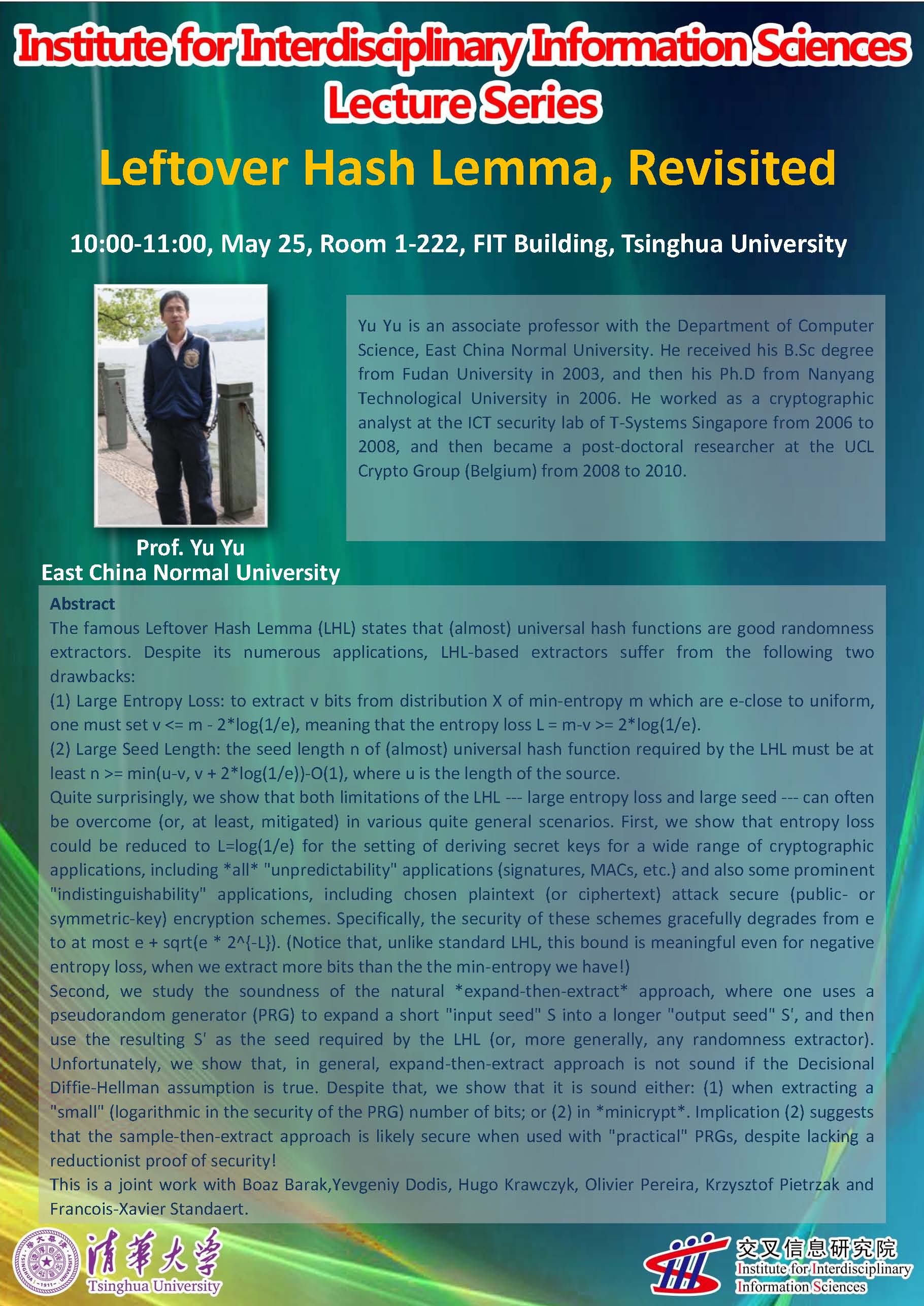 演讲人 <a href='//yuyu.hk/' target='_blank'>Yu Yu</a> East China Normal University 时间 2011-05-25 10:00-2011-05-25 11:00
