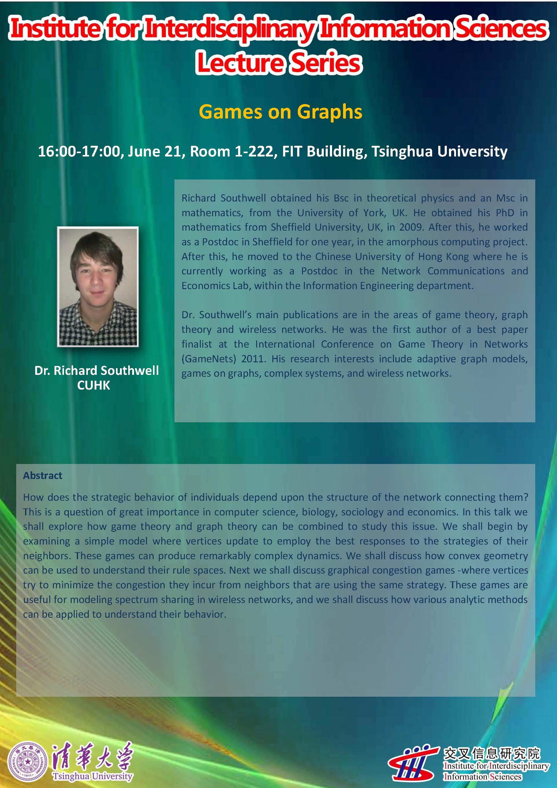 Richard Southwell obtained his Bsc in theoretical physics and an Msc in mathematics, from the University of York, UK. He obtained his PhD in mathematics from Sheffield University, UK, in 2009. After this, he worked as a Postdoc in Sheffield for one year, in the amorphous computing project. After this, he moved to the Chinese University of Hong Kong where he is currently working as a Postdoc in the Network Communications and Economics Lab, within the Information Engineering department.