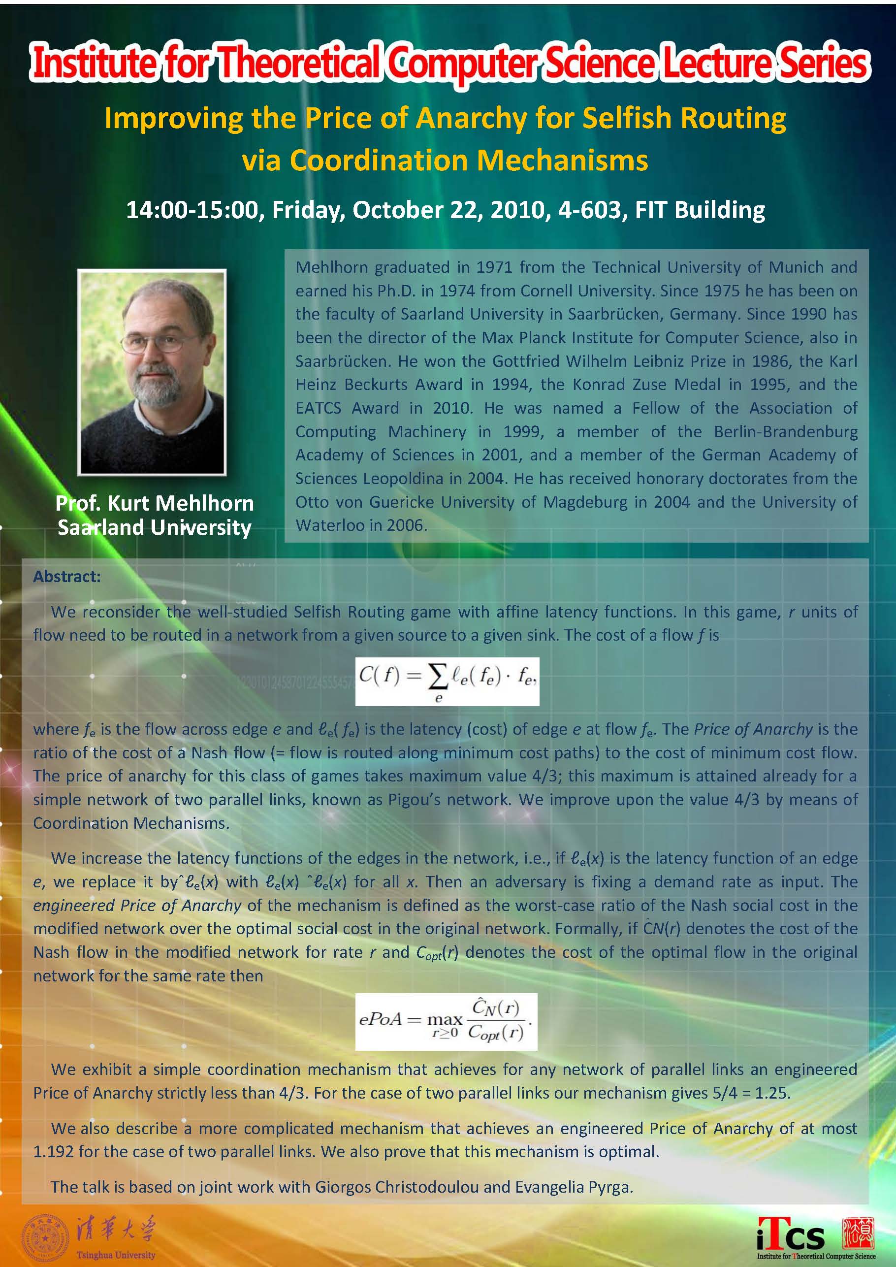 where fe is the flow across edge e and ℓe( fe) is the latency (cost) of edge e at flow fe. The Price of Anarchy is the ratio of the cost of a Nash flow (= flow is routed along minimum cost paths) to the cost of minimum cost flow. The price of anarchy for this class of games takes maximum value 4/3; this maximum is attained already for a simple network of two parallel links, known as Pigou’s network. We improve upon the value 4/3 by means of Coordination Mechanisms.