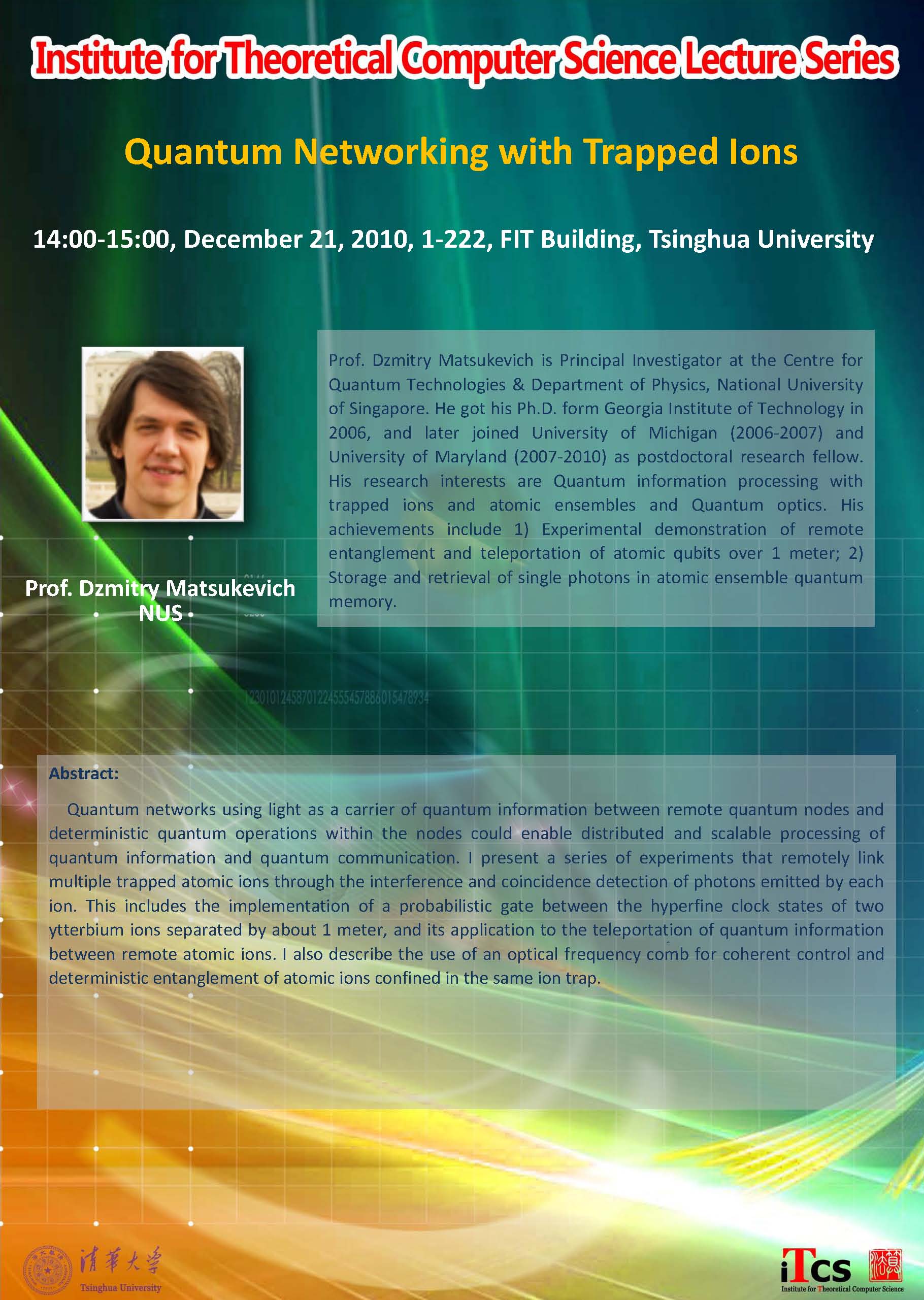 Prof. Dzmitry Matsukevich is Principal Investigator at the Centre for Quantum Technologies & Department of Physics, National University of Singapore. He got his Ph.D. form Georgia Institute of Technology in 2006, and later joined University of Michigan (2006-2007) and University of Maryland (2007-2010) as postdoctoral research fellow. His research interests are Quantum information processing with trapped ions and atomic ensembles and Quantum optics. His achievements include 1) Experimental demonstration of remote entanglement and teleportation of atomic qubits over 1 meter; 2) Storage and retrieval of single photons in atomic ensemble quantum memory.