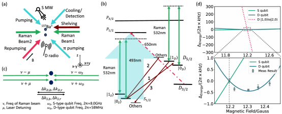 图一:137Ba+离子的相关能级与打光方案,同时展现复合编码量子比特低磁场敏感性