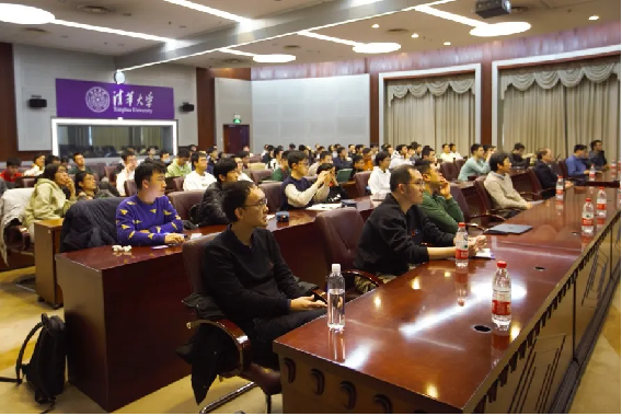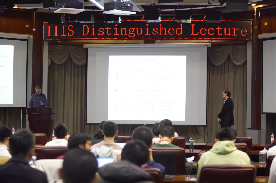 院长姚期智主持讲座。师生齐聚多功能厅,聆听讲座。