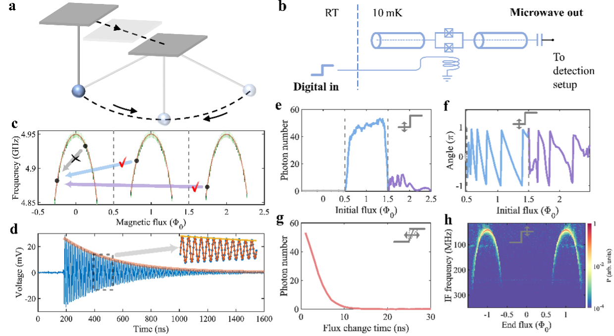 在此项工作中,研究人员首次在超导量子电路中发现了一种从真空中产生相干微波光子的过程。通过对嵌入超导谐振器中的超导量子干涉装置 (SQUID) 的磁通量进行数字化控制,产生的微波光子脉冲可以方便地调控相位、强度和频率。得益于其优异的相干性,微波脉冲可以方便地叠加以产生更加多样化的微波波形,与之前在低温环境中工作的微波光子源相比,具有明显的优势。此外,用于驱动微波源的类数字信号可以通过低带宽通道传输,例如双绞线,相比于当今技术中常使用的同轴电缆可以进一步降低其被动热负荷。实验中,研究人员展示了使用此微波脉冲发生器进行高保真度地量子比特状态读取。此器件结构简单、可扩展性强,并与超导量子电路兼容,有利于实现微波电子测控模块和超导量子比特在低温环境下的单片集成,从而为超导量子计算机的大规模扩展提供重要基础。