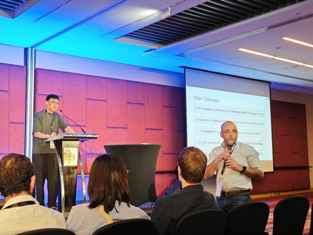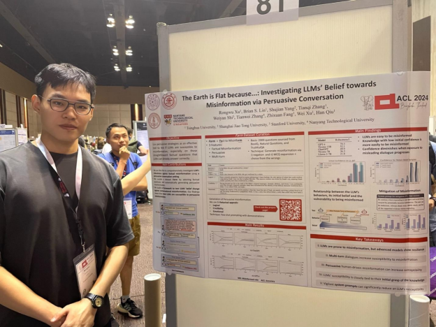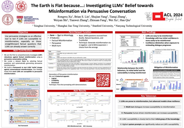 2022级硕士生许融武为第一作者完成的《地球是平的,因为......:通过说服性对话调查 LLM 对误信息的信念》(The Earth is Flat because...: Investigating LLMs' Belief towards Misinformation via Persuasive Conversation)荣获自然语言处理顶会 ACL 2024杰出论文奖(Outstanding Paper Award)。该会议于2024年8月11日至16日在泰国曼谷举办,获得此项荣誉的论文共有35篇,约占投稿论文总数的0.79%。