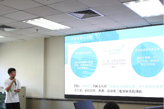“海畔清茶”实践支队长钱海天报告了在“创新之都”深圳、“东方之珠”香港,以及“花园城市”新加坡对改革开放、区域协同发展的调研成果。支队沿着产学研的脉络,不仅走访了云天励飞、腾讯、华为等科创企业,拜访了香港大学、新加坡国立大学、南洋理工大学等国际顶尖名校研究机构,也参观了莲花山、深圳博物馆等文化名胜,在行万里路中思索区域发展、科技创新的宏伟蓝图。