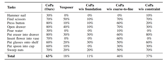 充分的现实世界实验展现了CoPa框架卓越的通用操纵表现。实验中,CoPa在各种日常操控任务(如图1右所示)中表现出高达63%的成功率,显著优于现有的方法(如表1所示)。这些任务包括从简单的“放置物体”到更复杂的“操作工具”等,充分展示了CoPa在处理多变环境和未知指令时的强大能力。