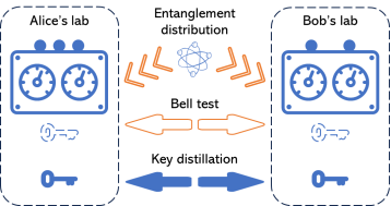 测量互补性原理和量子非定域性在量子通信与密码中发挥了重要作用。基于测量互补性原理,可以实现等具有信息论安全性的量子密码协议。另一方面,量子非定域性启发了仅基于量子力学正确性的密码协议设计。上世纪90年代,姚期智院士等研究者提出了通过贝尔不等式违背,实现具有设备无关特性的量子密码协议(图1)。然而,不同于使用可信设备的量子密码协议安全性分析,在设备无关量子密码学的发展中,测量互补性的作用并未得到明确。