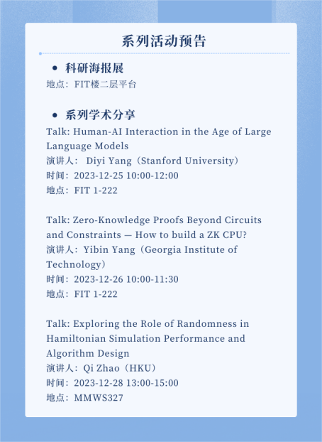 733期博士生学术论坛(IIIS Research Festival& Doctoral Forum)在FIT楼二层大厅拉开帷幕。科研年会和博士生论坛涵盖科研海报交流及展览、科研海报评比、特邀报告、茶歇交流等多个环节。段路明院士、黄隆波副教授、高鸣宇助理教授出席海报评奖环节并为获奖者颁奖。
