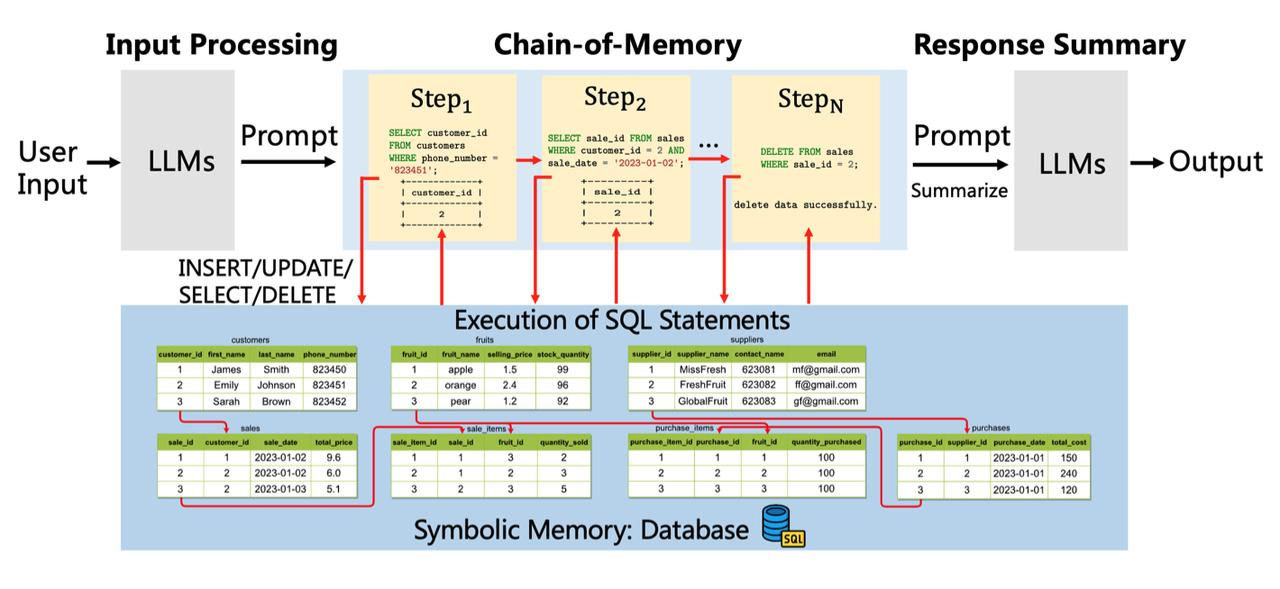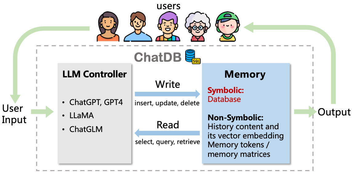 赵行研究组及其合作单位的研究者们提出一种新型符号性记忆框架ChatDB,突破了此前常用的记忆框架中对储存信息操作不精确、历史信息储存形式缺乏结构性等局限。该论文《ChatDB: Augmenting LLMs with Databases as Their Symbolic Memory (ChatDB:用数据库作为符号性记忆模块来增强大语言模型)》发布于康奈尔大学ArXiv,并在Twitter上被Elvis Saravia等知名机器学习和自然语言处理研究者转发。