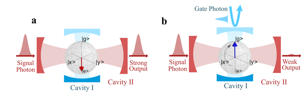 电子三极管是一种重要的半导体器件,它既可以工作在数字电路中实现经典逻辑门,又能够用于模拟电路实现电流放大。与之类似,单光子三极管是一种能够通过单个栅极光子控制输入光信号开关和放大的光量子器件,在光量子网络和全光计算领域具有重要的应用。但是由于光子之间的相互作用非常微弱,实现高性能的单光子三极管非常具有挑战性。在之前的工作中,有研究组借助单个原子、原子系综、或者半导体量子点实现了光子之间的有效相互作用,研制出了光波频段的单光子三极管,但受限于这些体系中不完美的量子操控或者相对较弱的光和物质相互作用,单光子三极管的有效增益最高不超过100,开关比也相对较差,极大的限制了可能的应用。