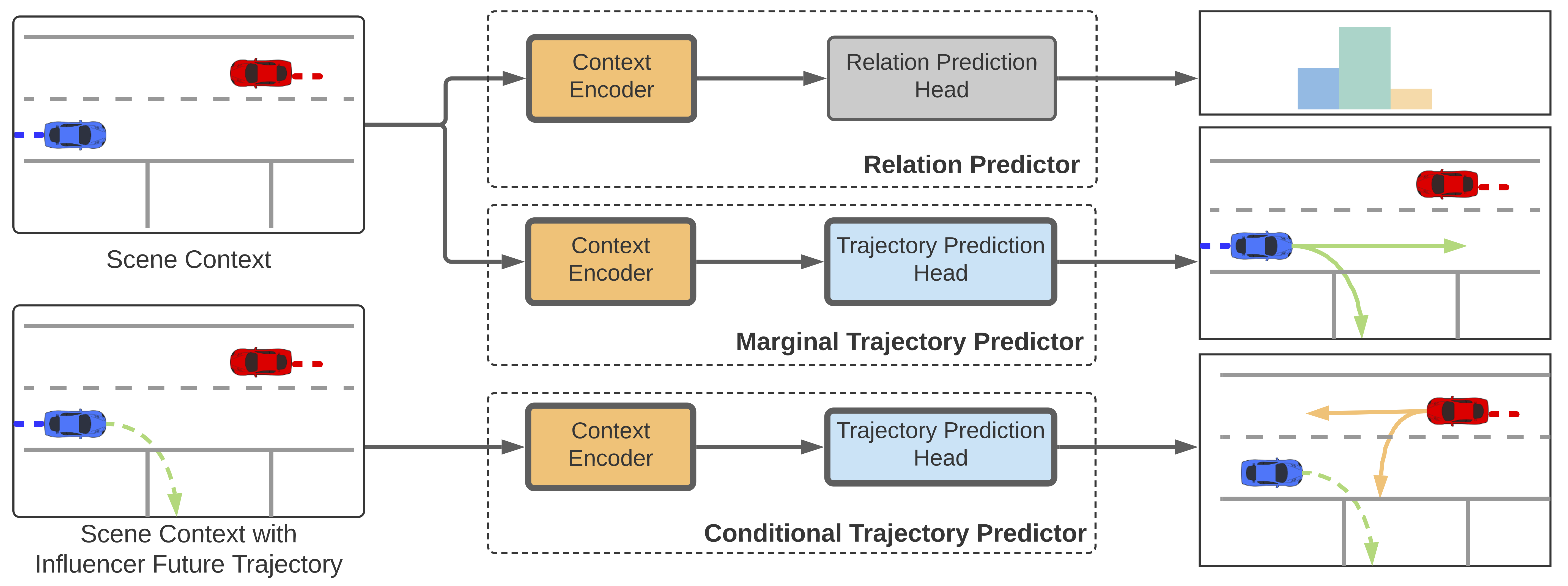 该研究提出了一种新的利用关系预测的轨迹预测的方法“M2I”。该方法首先预测场景中车辆之间的关系,然后通过先预测先行一方未来的轨迹,再用该预测结果预测让行一方轨迹的方法得到双方的联合预测结果。实验表明通过引入关系预测可以获得比其他方法在场景级别上更合理,也更准确的轨迹预测结果。