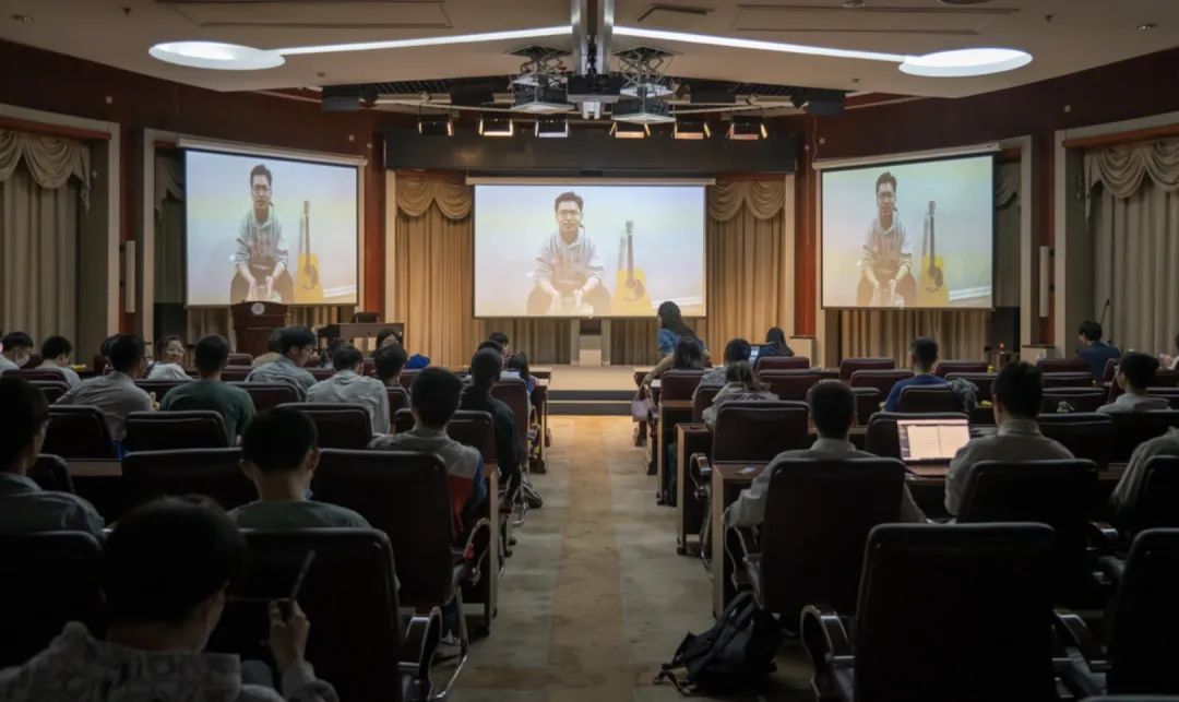 2017级的校友沈睿,作为第一个展示的达人,顶住了巨大的压力,为观众们娓娓道来了一段关于距离的佳话。沈睿动情的演唱引得现场掌声不断。