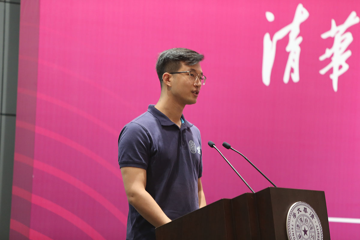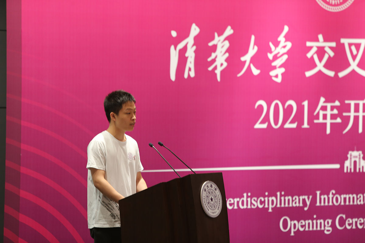 交叉研21班胡亦行代表全体研究生新生发言。他表示,在2021年这样的历史性交汇期,一定要不负总书记重托,将个人命运和国家命运相结合,在自身奋斗的同时为社会、祖国、乃至全人类做出自己的贡献。此外,胡亦行表达了研究生同学们励志开辟新方向、做最好的研究的信念,以及希望能和大家一起享受清华园提供的丰富多彩的活动机会。