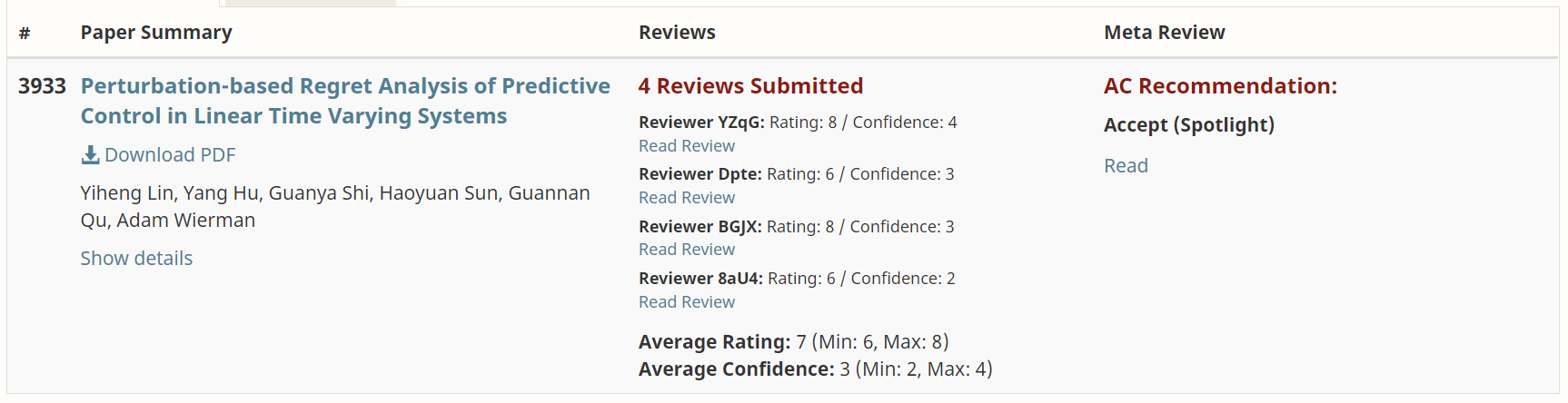 校友林一衡、2018级在校生胡扬作为共同第一作者完成的论文Perturbation-based Regret Analysis of Predictive Control in Linear Time Varying Systems近日被第三十五届神经信息处理系统大会(35th Conference on Neural Information Processing Systems,NeurIPS 2021)接收并评为焦点论文(Spotlight paper),本年度大会上获得该荣誉的论文占总投稿数的比例不到3%。该文旨在研究模型预测控制在一般的线性时变系统中性能的理论保证。