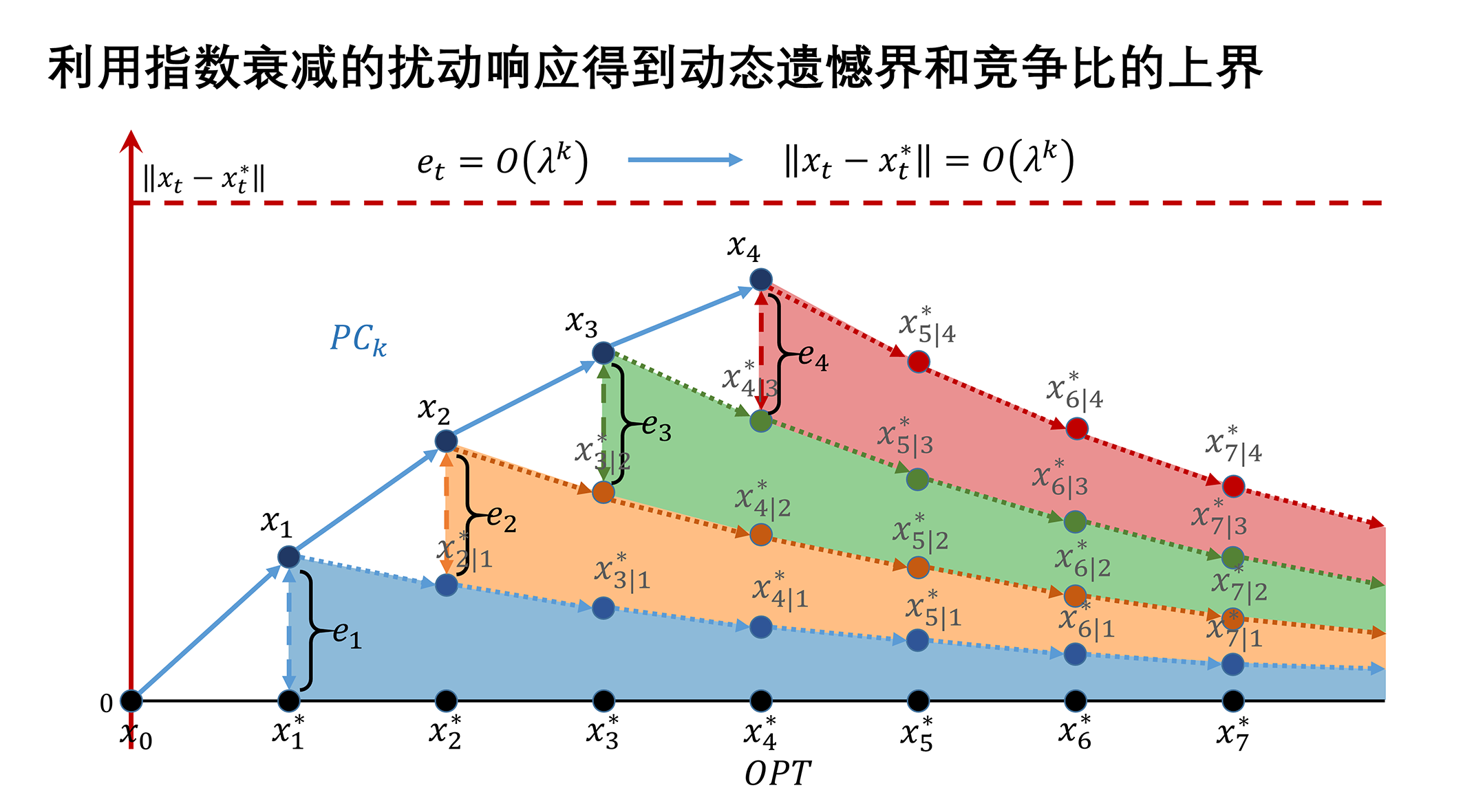在证明技术方面,研究指出:以往基于未来代价函数(cost-to-go function)或利用控制标准型(control canonical form)规约至优化问题的证明框架,对LTV系统均不适用。进而建立了一种基于扰动-响应分析的新证明框架:首先研究MPC控制器所给轨迹在系统参数扰动下的响应,建立指数衰减的扰动响应上界;随后,利用扰动响应上界证明动态遗憾界和竞争比的上界。由于不需要显式地求出最优轨迹或最优代价,可以期待这一证明框架的适用范围是广泛的:只要一种系统内可以建立类似的扰动响应上界,就可以立刻得到相应的理论性能上界。该分析框架也是该研究的重要理论贡献之一。