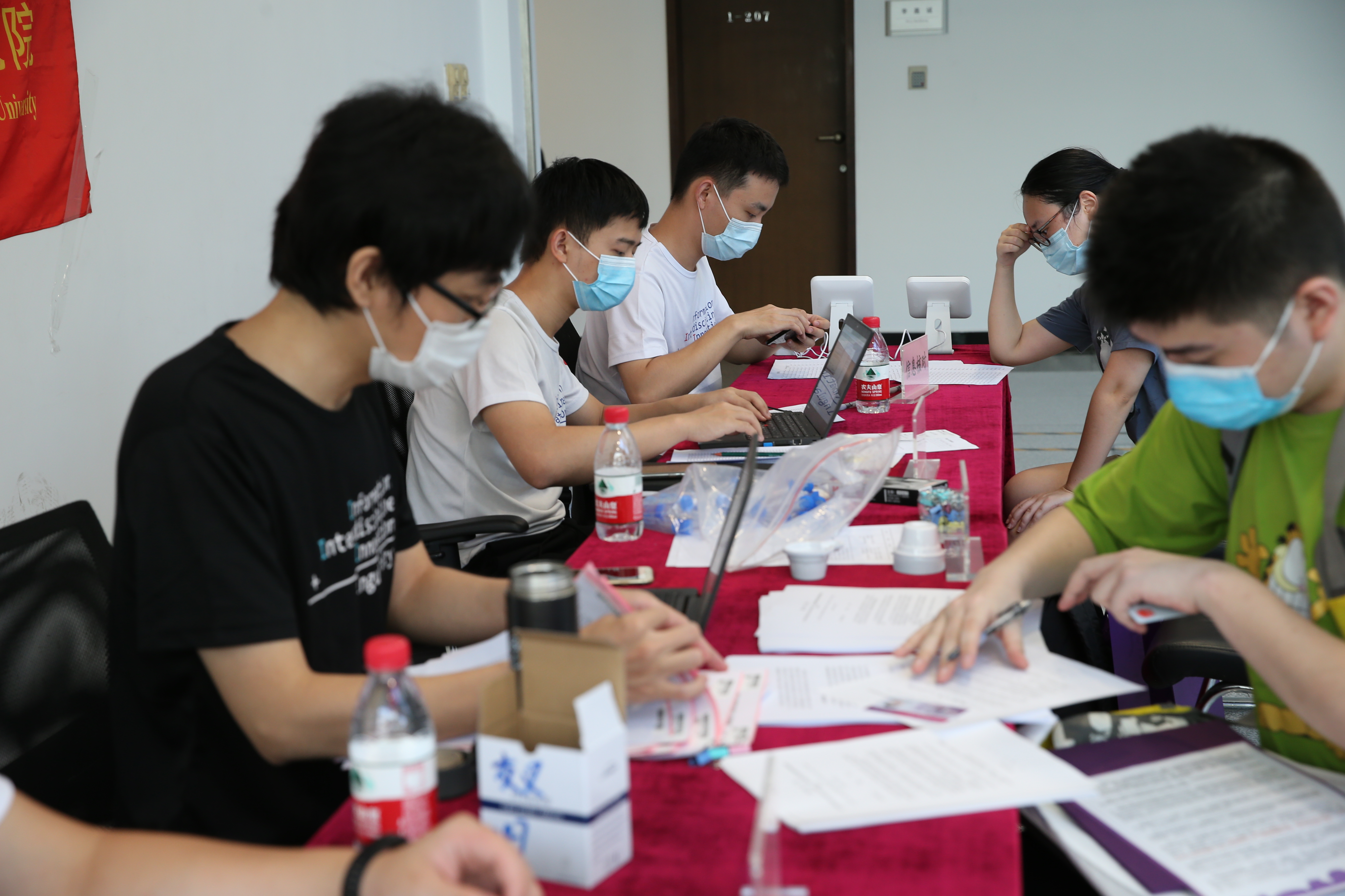 的迎新点设在FIT楼二层。不同以往,今年的迎新点为疫情防控增设了许多暖心的小细节。为控制人流量,避免聚集,特设等候处,并在等候处提供口罩及免洗除菌洗手液。无接触打卡签到设备取代曾经的指纹打卡设备。