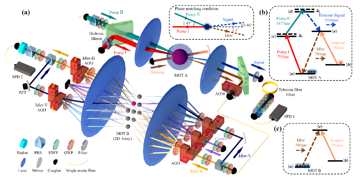 量子信息中心段路明教授研究组在量子中继网络领域取得重要进展,首次实现了在原子系综中将量子多路复用存储技术与通信光子接口技术相结合以远距离分发量子纠缠态,这一成果展现了未来构建大规模量子中继网络的可行性。该成果论文《Long-distance entanglement between a multiplexed quantum memory and a telecom photon (量子复用存储器与通信光子间的远距离纠缠)》近日发表于国际学术期刊《物理评论X》(Phys. Rev. X)上。
