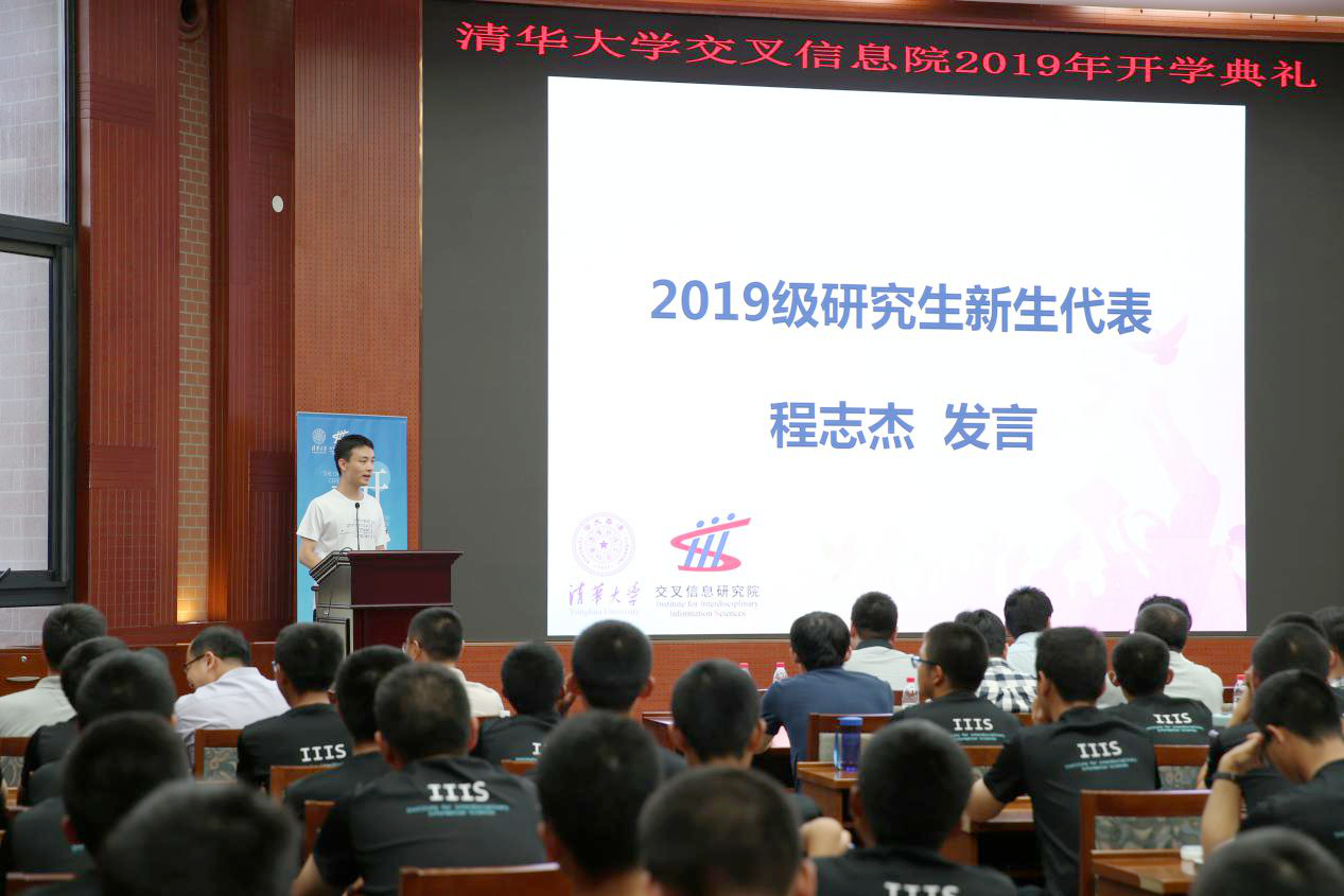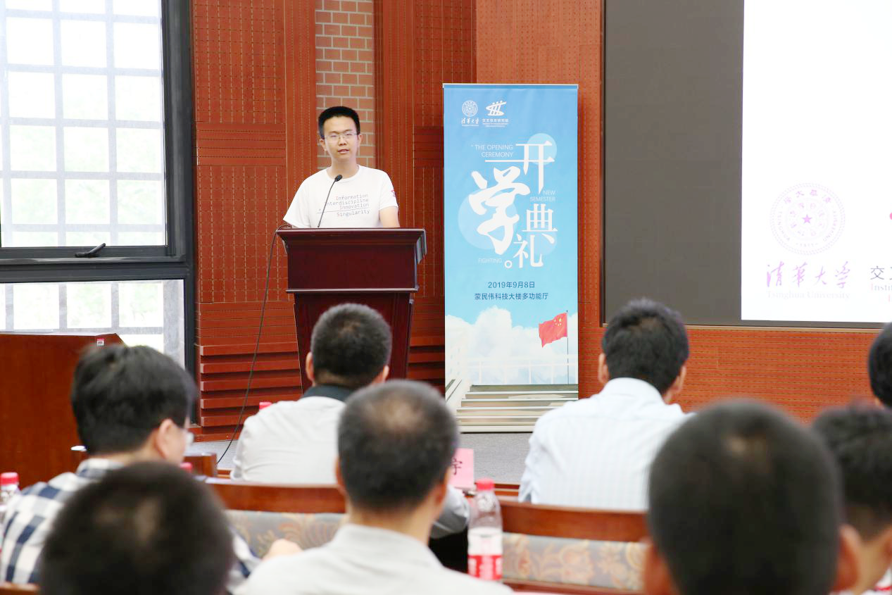 交叉研19级直博生程志杰代表研究生新生发言。本着对未知事物强烈的好奇心和不断追求真理的决心,程志杰选择了物理专业,他还引用邱勇校长在2019级研究生新生第一课上提到的“清华人的重要特质是肩负使命”,指出青年人应该利用好学校和学院提供的资源,为祖国的科技发展、为民族的复兴、为人类的进步贡献自己的一份力量。