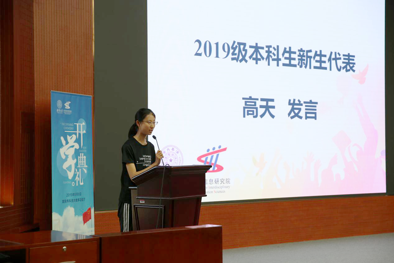智90班新生高天代表本科生发言,她首先回顾了为期三周的军训生活,这是新生们第一次以清华人的身份感受清华园的百年积淀,在艰苦的军训同时也深刻体会了集体生活的温暖。高天表示,要坚持为人工智能梦奋斗,真正做到知识、能力、价值三位一体全面发展,成为一个拥有伟大创造力、远大理想抱负和深厚家国情怀的清华君子。