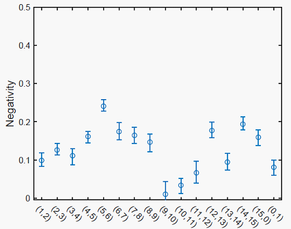 图二:各子系统的负度(negativity):如果任一子系统不是纠缠的,其负度是0