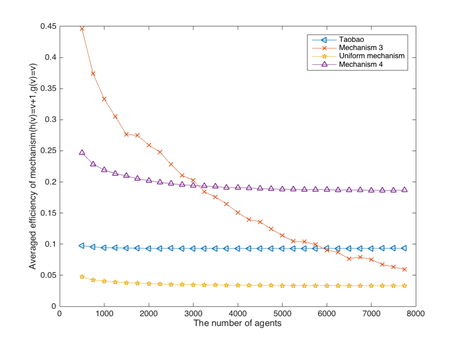 针对这个问题,唐平中研究组从博弈论和机制设计的角度,提出了一个全新的防止刷单的理论模型和相应的实现算法。在这个模型中,推荐的流量分配被建模成一个可分割资源的问题,卖家参与刷单的成本大于刷单得到流量提升带来的收益,因而卖家不会选择刷单。之后对阿里巴巴提供的购买数据进行分析处理,模拟论文中提出的机制,发现机制带来的总成交量优于淘宝现有的推荐算法。下图为模拟实验的结果:
