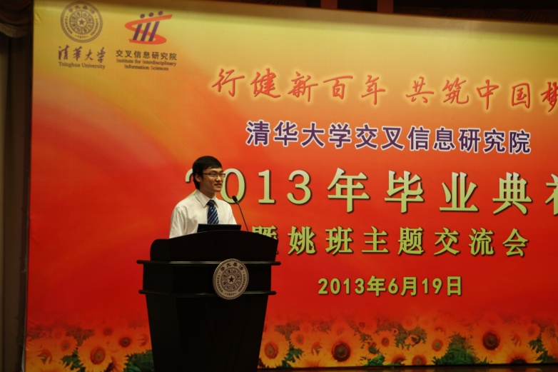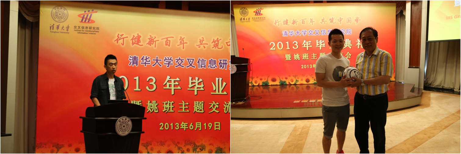的学习和生活,感谢母校和师长,并表示将怀揣“中国梦”,在以后的学习和工作中勤奋刻苦、成才报国。之后,毕业生代表分别向姚期智院长赠送了纪念品。