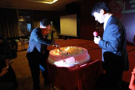 伴随着姚先生的新年致辞,一轮恰似粉色圆月的生日蛋糕喜庆登台。姚先生亲手切下第一刀,带来欢庆元旦、辞旧迎新的节日祝福,更带来开车漫画