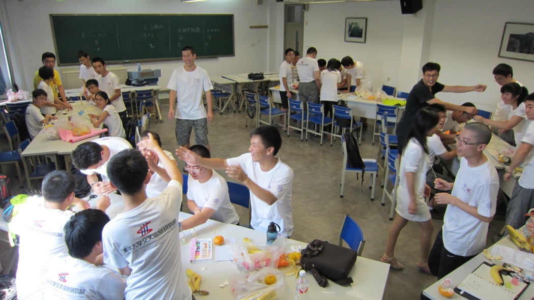 在第一个环节,同学们分作四队,每队同学开动脑筋,设计了别有新意的队名、队徽和口号,演唱了队歌,并且每位同学都在这个环节中做了各具特色的自我介绍,大家很快就熟悉起来。