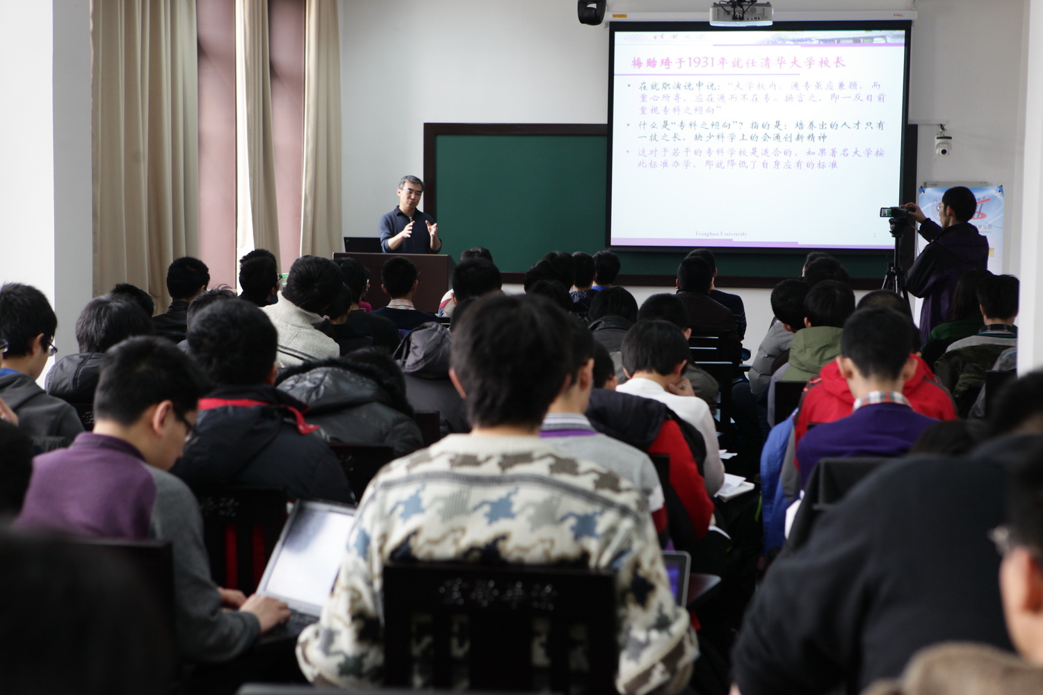 白教授在一个小时的讲座中与同学们探讨大学“构建社会精英交流平台”的教育目标。通过对欧洲、美国与中国大学在纵向和横向两个历史维度上的比较,白教授分析职业教育与高等教育本质上的不同恰如同盖平房与建高楼的差异,他勉励同学们在本科期间重视知识上的“通”与“精”,为更深远的学术道路打下坚实的综合基础。