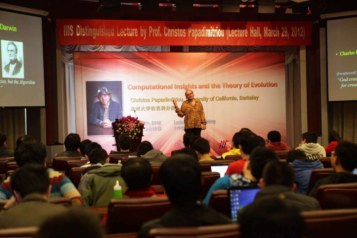 3月29日下午,信息技术大楼(FIT楼)多功能厅座无虚席,Christos Papadimitriou教授做了主题为“Computational Insights and the Theory of Evolution”的特邀演讲。他在演讲中介绍了计算机科学研究与进化论研究的关联,以及自己将计算理论运用于进化论研究的相关成果,比如如何通过计算方式优化基因选择等。Papadimitriou教授以其科研经历生动阐述了计算机科学为其他科学学科所提供的深入洞察力。诚如姚期智先生在演讲主持词中所指出的,Papadimitriou教授具有独特的科学研究视角,数学通常被认为是科学研究之后,但在Papadimitriou教授的理解中,计算机科学则是科学研究之王。