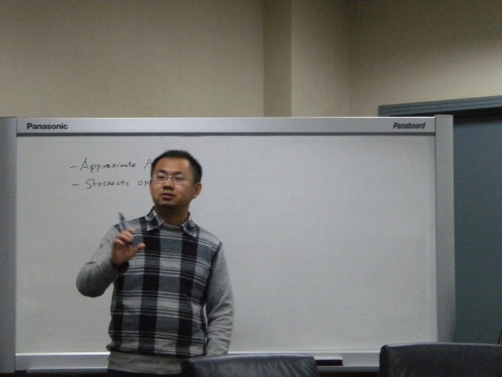 活动开始,各位嘉宾分别向同学们介绍了个人和所在课题组的研究领域。李建老师介绍了理论计算机科学研究方向,并向同学们展示了近似算法、密码学等课题的最新科研成果;华强胜老师的主攻方向是无线网络与算法,介绍了网络科学在与产业界的紧密联系;乔友明、楼天城分别介绍了复杂性和社交网络等研究内容;郑波和祖充介绍了量子信息研究方向的相关情况。这个环节使同学们对我院的研究领域和具体内容有了进一步的了解。